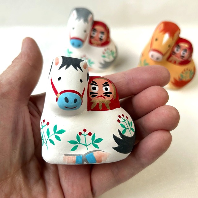 可愛らしいダルマを乗せた午の土鈴です。赤い実のなる草地に座った仔馬と背中のダルマ。仲良く寄り添いあう姿が微笑ましいです。中に土玉が入っていて、振るとカラカラと音がします。一つ一つ手作りのため、お顔や模様、色合いに個体差があります。写真サンプルは参考としてご覧ください。 立髪の色は濃いグレーと薄いグレーの二種類あります。 〈おおよそのサイズ〉 幅55㎜ × 奥行き40㎜ × 高さ60㎜ 重さ 75g前後 〈作り方〉 中に玉を仕込んで素焼きした土鈴に一つ一つ丁寧に絵付けをします。 絵付けは、顔料(鉱物や貝などの色粉)と膠(動物の骨や皮をに溶かして固めたもの)を使った昔ながらの方法でしています。 〈ご注意〉 ※本体は素焼きの焼き物なので、衝撃には弱く割れやすいです。 ※水や熱に弱い絵具を使用しているため、水拭きや多湿、直射日光はお避けください。 ※PCやスマホの画面環境によって実際の色合いと多少違う場合があります。