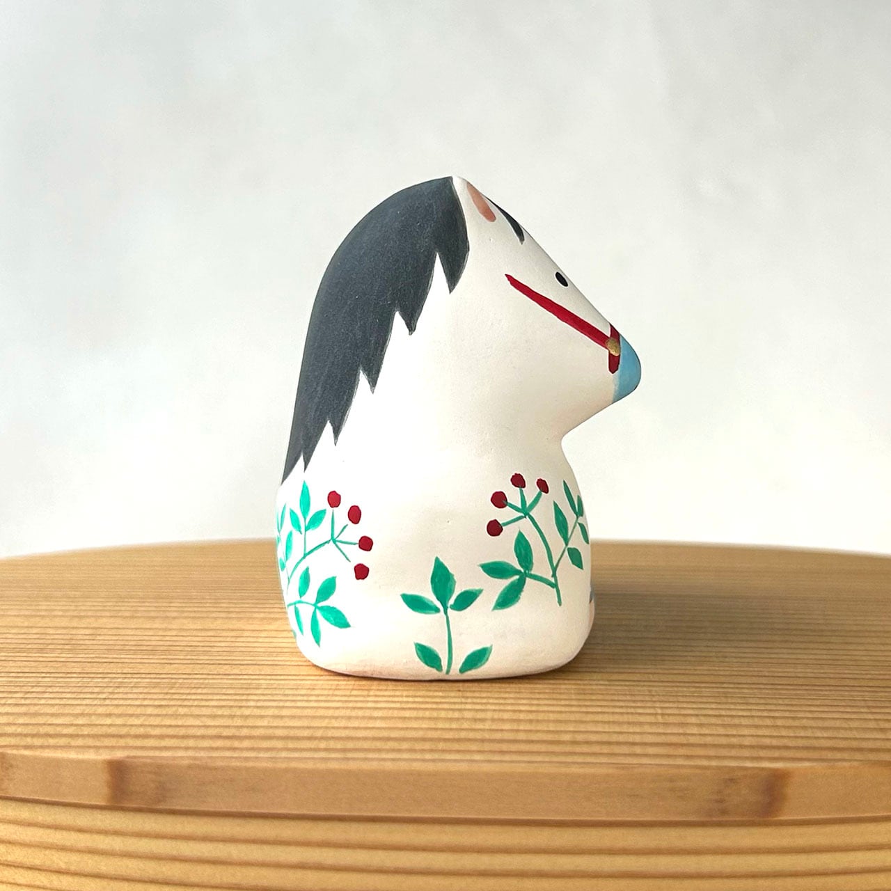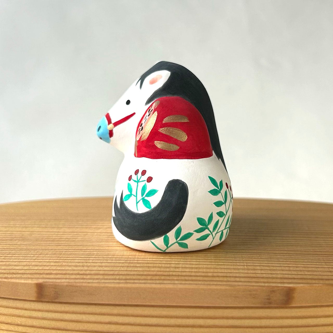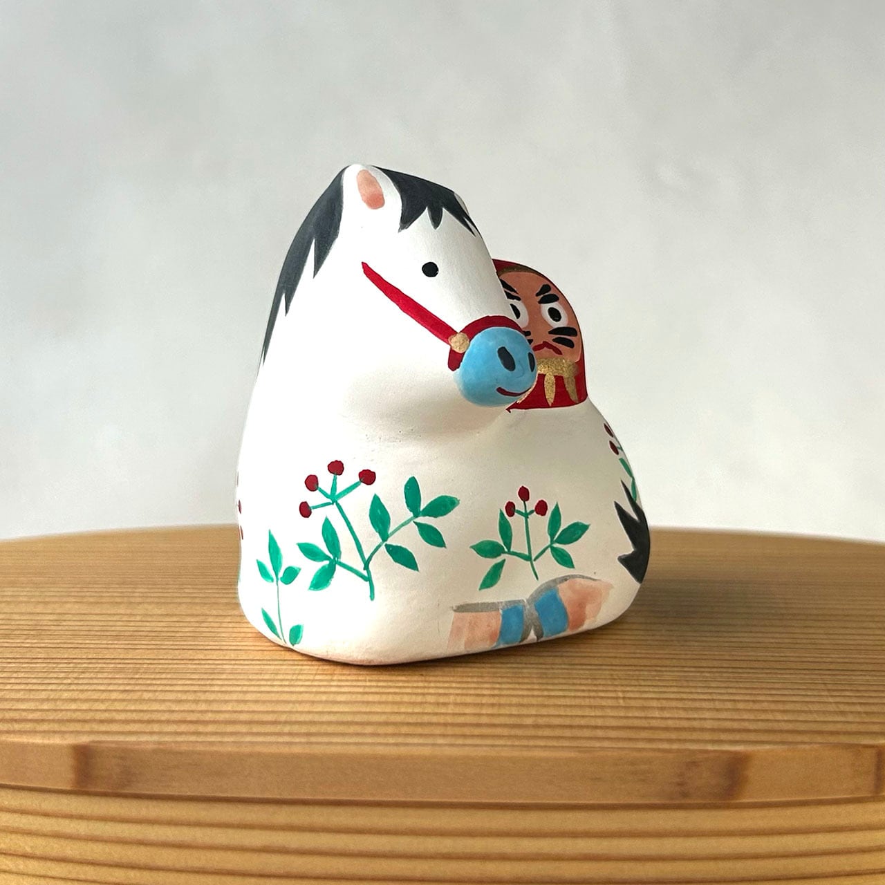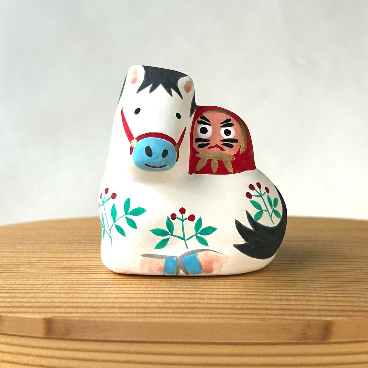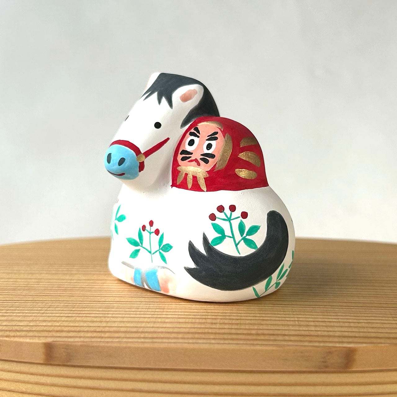 可愛らしいダルマを乗せた午の土鈴です。赤い実のなる草地に座った仔馬と背中のダルマ。仲良く寄り添いあう姿が微笑ましいです。中に土玉が入っていて、振るとカラカラと音がします。一つ一つ手作りのため、お顔や模様、色合いに個体差があります。写真サンプルは参考としてご覧ください。