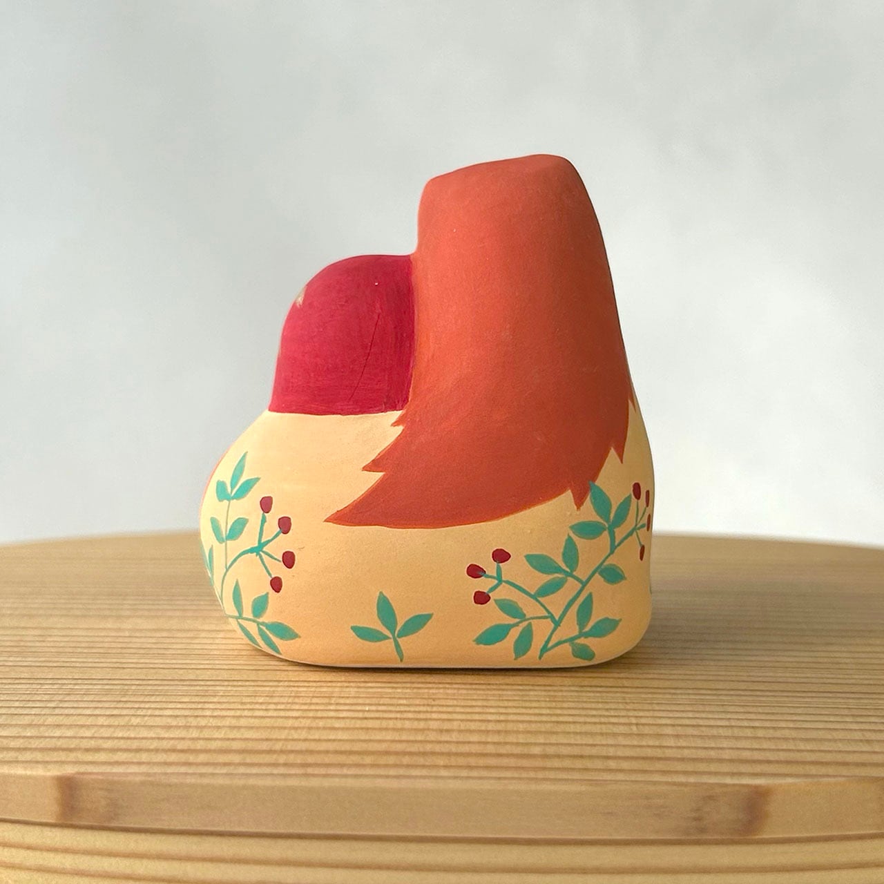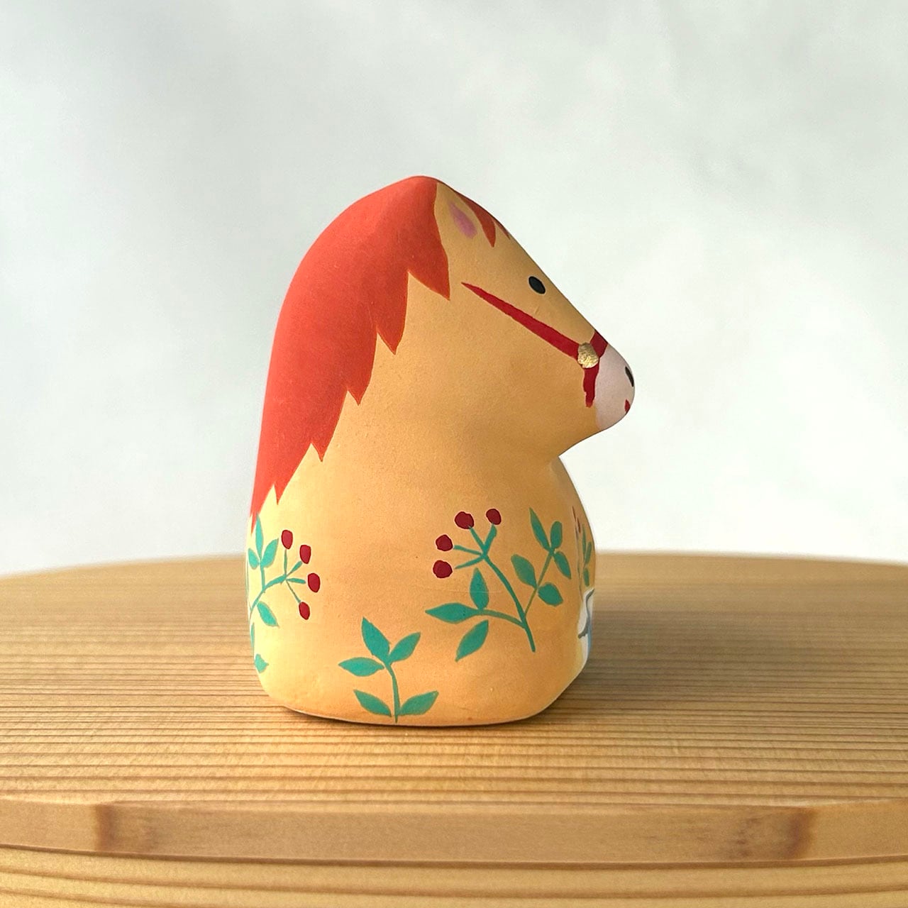 可愛らしいダルマを乗せた午の土鈴です。赤い実のなる草地に座った栗毛の仔馬と背中のダルマ。仲良く寄り添いあう姿が微笑ましいです。中に土玉が入っていて、振るとカラカラと音がします。一つ一つ手作りのため、お顔や模様、色合いに個体差があります。写真サンプルは参考としてご覧ください。